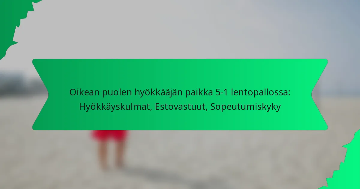 5-1 lentopallojärjestelmässä oikean puolen hyökkääjä on olennainen osa sekä hyökkäys- että puolustusstrategioita. Tämä asema vaatii hyökkäyskulmien hallintaa, jotta pisteytysmahdollisuudet optimoituvat, samalla kun se ottaa merkittäviä torjuntavastuita. Lisäksi sopeutumiskyky on avainasemassa, sillä oikean puolen hyökkääjän on nopeasti mukautettava peliään erilaisiin pelitilanteisiin ja joukkueen dynamiikkaan tehokkaan pelin ylläpitämiseksi.